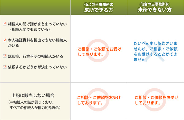 このようなことから、下記のいずれかに該当する場合には、宮城県外からのご相談・ご依頼はお断りしております(宮城県外の方であっても、事務所に直接お越しいただける場合には、ご依頼をお受けしております。)。